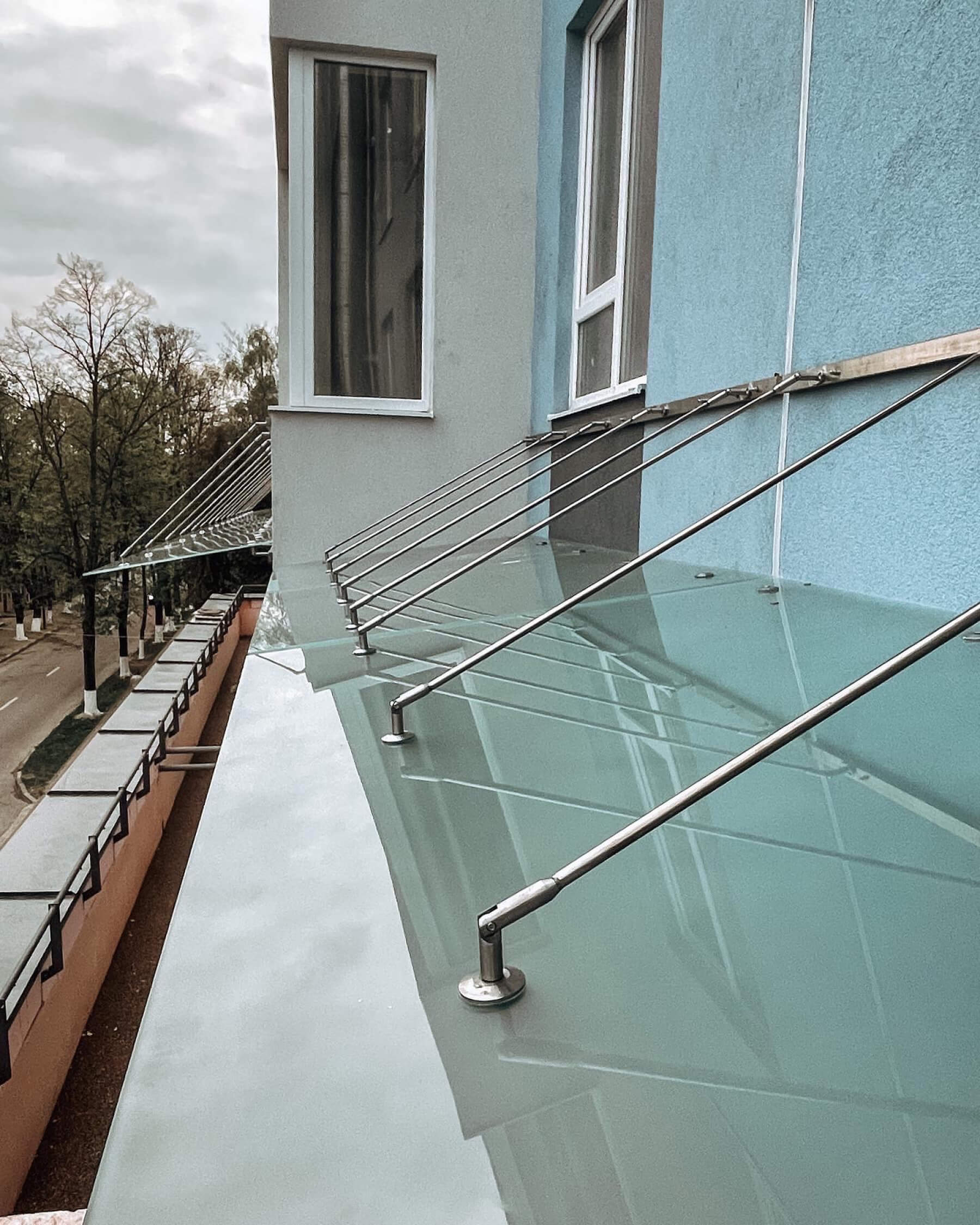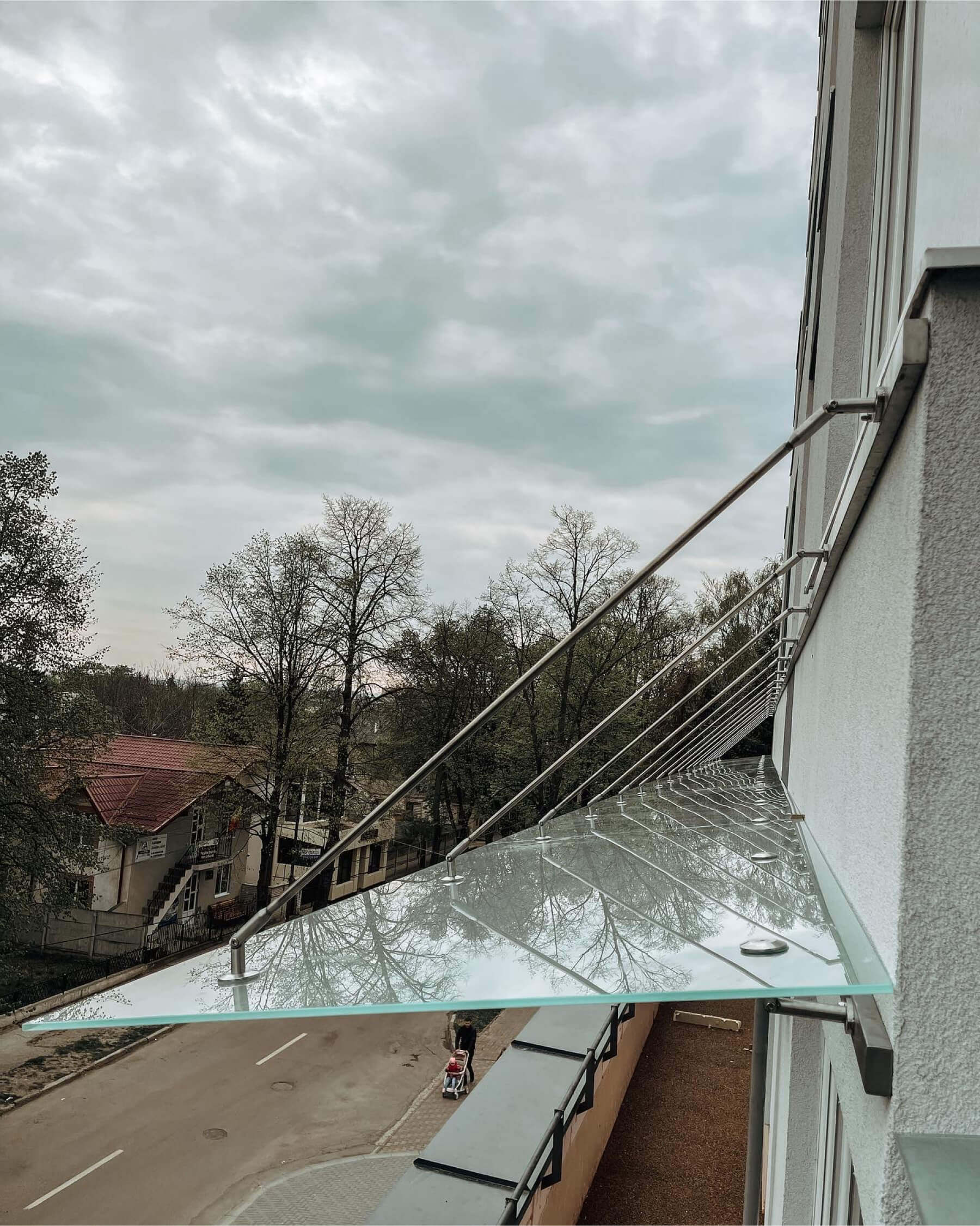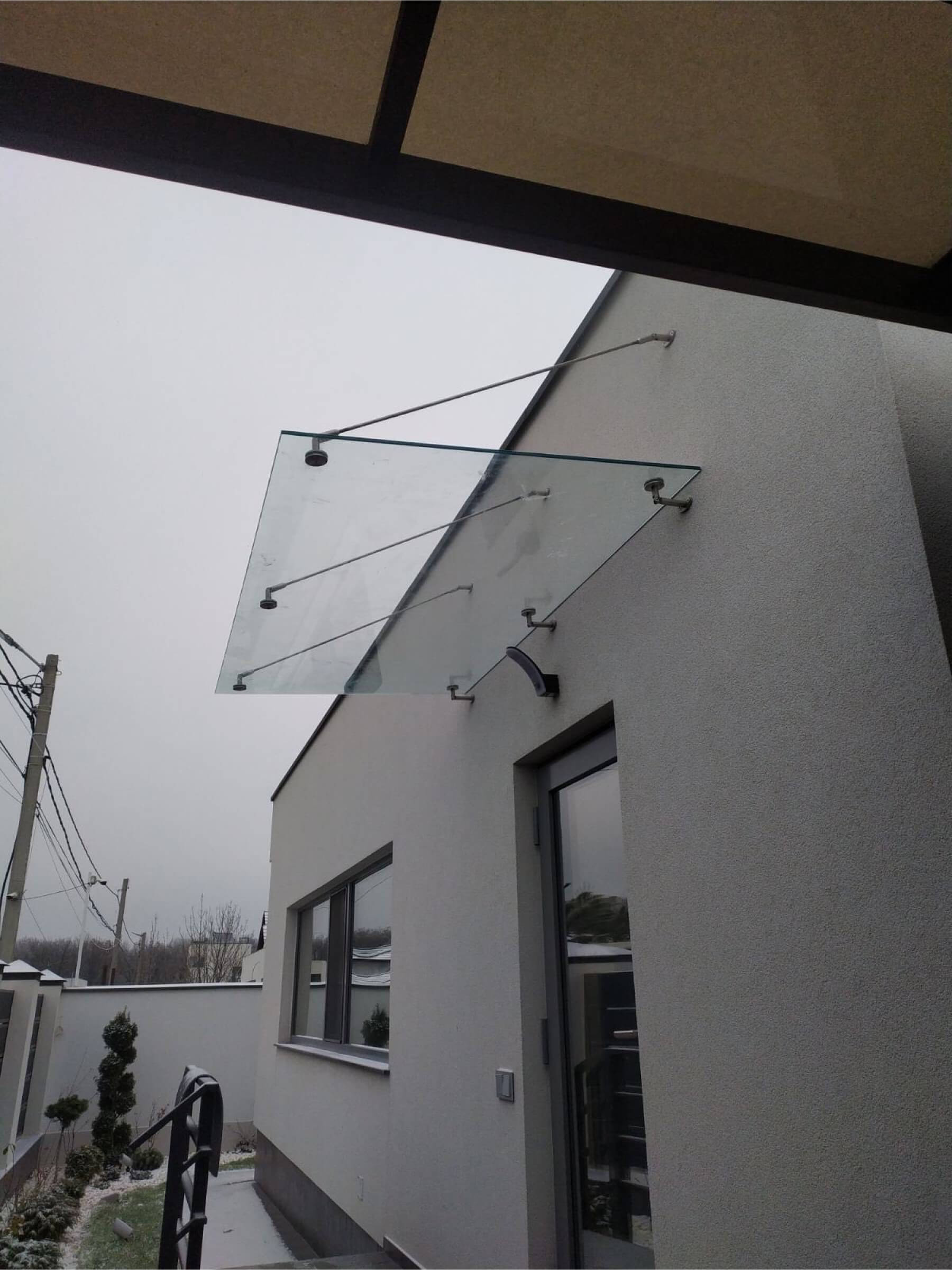 Pentru fixarea unei copertine de sticlă se utilizează elemente din oțel inoxidabil, acestea fiind rezistente și atractive din punct de vedere estetic.