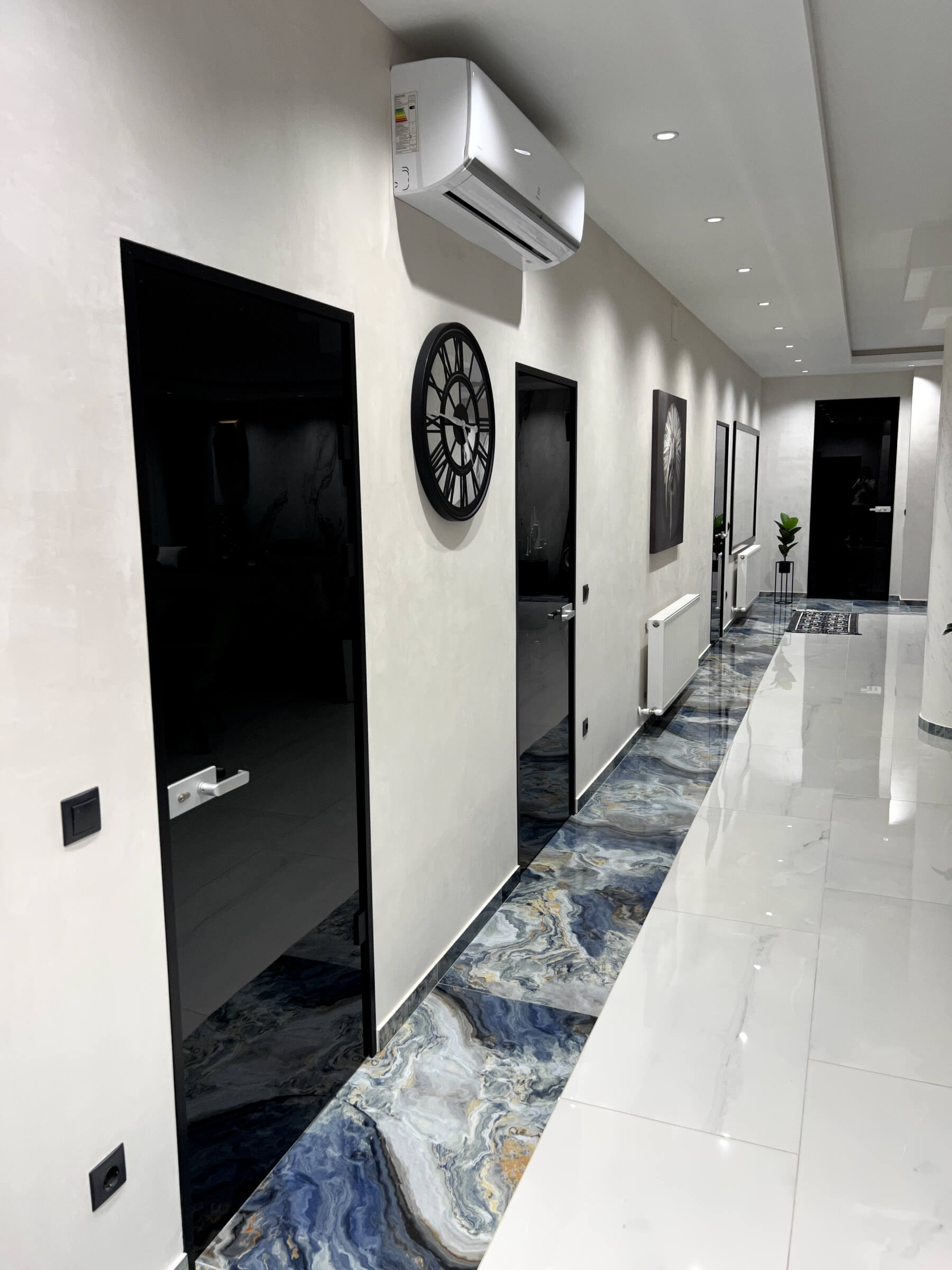 Avem flexibilitatea de a vă oferi o gamă variată de opțiuni personalizate, inclusiv alegerea culorii sticlei: clară, sablată sau colorată (bronz, gri, etc.), precum și a culorii feroneriei, care poate fi vopsită în orice nuanță din paleta RAL, în funcție de designul preferat.
